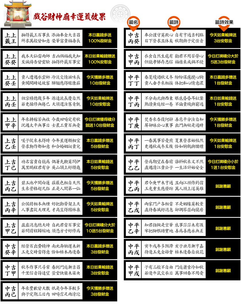 ★活動辦法:玩家每天在財神廟開啟後,可以參加幸運財神遊戲。每次遊戲會提供9種獎品,透過捐獻香油錢就能隨機獲得其中1種,每項獎品會隨著出獎越多來變化燈號顏色,當幸運財神的聚寶盆變為紅色狀態時,請不要猶豫,趕快投入您的信念,有機會大獎就是您的囉!!